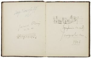 Joli album d'autographes d'une personne originaire du Sud-Ouest, Paulette Laborde, qui a signé en tête. Y figurent notamment un dessin du dessinateur Henriot (La Sonate au Clair de Lune, lavis aquarellé, Salies 1918) ; des citations musicales par Georges Guiraud (amusant extrait d'un Hymne au travail, 1919), J. Guy Ropartz (citation du Rêve sur le sable, Strasbourg 1920), Vincent d'Indy, Gabriel Pierné, Georges Enesco, Georges M. Witkowski, Pierre de Bréville, Reynaldo Hahn (« Les sanglots longs des violons »...), Jules Mazellier ; des autographes de Joseph Bédier, Hélène Vacaresco (poème), Maurice Barrès, Émile Henriot, Léon Frapié, Colette, Catherine Deneuve... Plus des signatures du général de Castelnau, Arthur Honegger, Rudyard Kipling, le maréchal Lyautey, Serge Prokofieff, Maurice Ravel, Rabindranath Tagore, Jéröme Tharaud, Émile Vitta, etc.