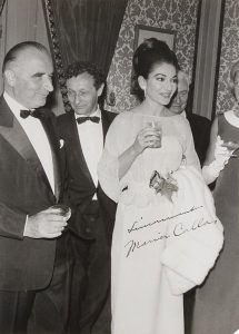 Belle photographie de la cantatrice habillée de blanc dans une réception, avec Georges Pompidou et Jean-Louis Barrault à ses cotés : « Sincèrement Maria Callas ».