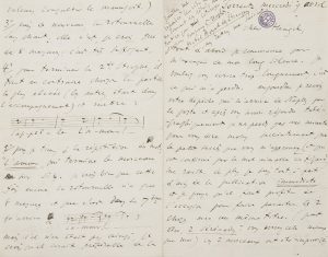 Belle correspondance musicale sur ses ballets et opéras. Samedi [1876 ?], au sujet de son ballet Sylvia ou la Nymphe de Diane. Il ne bouge pas de sa table de travail et est « effrayé de la tâche que je me suis imposée, d'orchestrer en 2 mois %, 3 gros actes ! Mais, à aucun prix, je ne veux être la cause d'une heure de retard »... Le lendemain a lieu la double audition de Lauwers et de Mlle Fauvelle, « à laquelle on songe pour le role de Diane [...] Votre opinion aurait un grand poids sur la mienne, toujours si indécise ; et il s'agit là d'une question capitale ! »... 2 janvier[1880 ?], à propos de Jean de Nivelle. Il a vu Carvalho, « toujours très chaud pour notre affaire ». Il aimerait dès à présent se mettre en relation avec Mlle Vauchelet. « J'ai dïné avec Faure qui nous attendra M. Taskin et moi samedi matin pour lui faire dire le role. J'ai été enchanté à tous égards de M. Taskin, mais... c'est un peu trop haut ! »... -« toute la 1ere moitié du 2nd acte est arrangée autrement. Notre personnage principal n'arrive plus que pour la scène : “Voici un mois que je vous cherche”. Le role du comte de Charolais prend beaucoup plus d'importance et est plus musical »... Lundisoir: « Cette vocalise m'inquiète. Si nous prenions quelques consultations à cet effet d'un professeur de chant émérite - Bax, par exemple ? Peut-être en une ou deux séances sur ce seul passage arriverait-il à faire exécuter agréablement ce casse-cou à notre jeune Arlette bruxelloise -qu'en pensez-vous ? Tout ce qui est diction, expression, gout, style, je m'en charge à merveille. Mais, à propos de cette diable de vocalise, je en sais que faire pour obtenir un résultat ».... Jeudi matin : « notre air-fabliau va être bien criblé de traits, de variantes, de facilités et je crains que cette orgie de lignes supplémentaires et de versions diverses ne fasse un bien vilain effet ! » ; et il donne le détail des corrections à faire, en indiquant bien les variantes de facilité, et mettant en d'autres endroits « la mention variante (ou version) de Mfle Bilbaut-Vauchelet [...] Autrement, comme les autres variantes sont indiquées comme étant du choix de Mlle Vauchelet et exécutées par elle, on croira que celles-ci sont aussi faites par Mlle Vauchelet et on les fera de préférence - ce que je voudrais éviter à tout prix ! Cette version en triolets est seulement à l'usage des mazettes »... Jeudi. Il a pris rendez-vous avec Carvalho pour lui faire entendre son 1er acte : « Il insiste absolument pour passer cette saison-ci. Il a pour cela une raison qu'il ne m'a pas dite [...] Quant à moi, je suis bien décidé à ne pas m'occuper de mes confrères, ni de leurs collaborateurs et à faire tous mes efforts pour tâcher de produire une bonne chose. C'est certainement là le principal »... Mercredisoir. Il est très attelé à ce « diable de final » qu'il lui envoie « pour le mettre bien d'accord comme texte, notes, nuances, indications de scène et autres, sans compter mes modifications à l'arrangement de piano »... Mercredi soir. Envoi de son travail achevé : « Si vous êtes aussi satisfait de le recevoir que moi de l'avoir fini, ce n'est pas peu dire ! J'ai du réécrire plusieurs passages du dernier acte. J'avais fait dans les dernières répétitions des modifications d'instruments qui ne figurent pas dans la partition de l'opéra. [...] J'ai fait intercaler dans le 2e acte les morceaux coupés, parce que je désire qu'on les joue »... Choisy-au-Bac dimanche soir [1888 ?]. Il vient de composer un petit morceau « à deux temps, très rythmé et d'un mouvement assez animé ! », pour l'album du Gaulois : « Le seul titre qui lui convienne - et à moi aussi - est Rigaudon. Je tiens donc particulièrement à ce qu'on réserve ce titre. [...] Tous les autres titres de danses anciennes sont à 3 temps - et ce que j'ai fait est à 2 temps ; je ne puis donc changer »... Sorrente 9 avril [1891], pour la publication de ses deux Sérénades : « Ces 2 morceaux ont été improvisés dans des conditions identiques, ils font suffisamment contraste et les 2 grands noms de Musset et d'Hugo sont deux magnifiques pendants »... Quant aux Lavandières de Ruy Blas, il a remis une « partitionnette » à Perrin, « contenant le chant et l'orchestre minuscule que je désirais (un double quatuor jouant pizzicato, 2 flutes et un tambour de basque). J'y ai joint, je crois en être sur, le chant, avec un accompagnement de piano. C'est cela qu'il faudrait prendre pour la publication. [...] Il est bien entendu qu'il faut publier la chose pour une voix seule ». Il donne les instructions à suivre en ce sens (avec 3 citations musicales) : supprimer les notes chantées par le chreur sur la ritournelle, répéter le mot l’amour qui termine le morceau, etc. Quant à la deuxième sérénade, « inutile d'ajouter que le chant doit être écrit en clé de sol » ; il donne 3 citations musicales pour la ritournelle. Il relate son voyage en Italie, et se réjouit du succès du Roi l’a dit... Il a trouvé les reuvres d'Ambroise Thomas « triomphantes dans toutes les grandes villes de l'Italie : Florence, Rome, Naples ! »... D'autres lettres concernent une audition avec Mlle Merguiller ; le comportement de Carvalho ; une conversation avec le directeur de l'Opéra Vaucorbeil ; une représentation à l'Hippodrome... Etc.