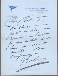 Isadora DUNCAN (1877-1927) danseuse américaine. L.A.S. et photographie signée ; 1 page in-8 à en-tête Claridge’s Hotel, et carte postale.