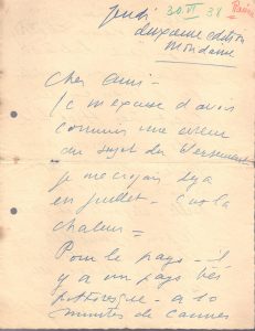 Il prie son correspondant de l'excuser à propos d'une erreur de versement : « Je me croyais déjà en juillet. C'est la chaleur. Pour le pays, il y a un pays très pittoresque - à 10 minutes de Cannes, Cagne le Vieux - avec son vieux château et on peut habiter ou à Cannes ou à Antibes ou à Juan les Pins. C'est très Hich Life »... Il le prie de faire attention au role de sa fille [Paulette] : « Belle, élégante et gaie ». Pour la jeune fille, il suggère Yvette Lebon : « elle fait sportive, elle est jolie »...