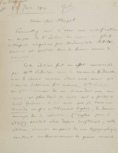 Saint-Saëns souhaite apporter une rectification à un article du Ménestrel au sujet de l'édition des reuvres de Gluck, commencée par Mlle Pelletan avec le concours de B. Damcke : ce « savant musicien étant mort avant que l'reuvre laborieuse fut achevée, Mlle Pelletan me fit l'honneur de me demander mon concours, et plus tard, je restai seul à porter ce lourd fardeau. Ce fut ainsi que je terminai Armide et fis entièrement Orphée », en s'appuyant pour cette dernière édition sur des parties d'orchestre conservées à l'Opéra de Paris, et non utilisées par les précédents éditeurs de Leipzig. Il reste à faire Écho et Narcisse, Orfeo, Alceste, Elene e Paride, « et tous les ouvrages de la première manière de l'auteur. Dans mon livre Harmonie et Mélodie, j'ai raconté l'histoire de mes relations artistiques avec l'admirable femme qui fut Mlle Fanny Pelletan. J'ai collaboré pendant plus de dix ans à l'édition qui porte son nom et il me serait pénible que le mien fut oublié quand on parle de cette reuvre impérissable, à laquelle a présidé la conscience la plus scrupuleuse et le seul amour de l'art ». [Cette lettre a été insérée dans Le Ménestrel du 26 juin 1909.]
