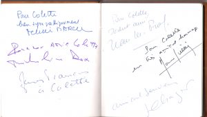 Jean d'Ormesson, Jean Dutourd, Roger Carel, Jean Amadou, Patrick Préjean, Edgar Faure, Jean-Claude Brialy, Bernard Menez, Roger Pierre, Félicien Marceau, Micheline Dax, J.M. Proslier, Marcel Jullian, Jacques Chazot, Jacques Chancel, Claude Piéplu, Thierry Le Luron, Pierre Bellemare, Georges de Caunes, Robert Lamoureux, Line Renaud, etc. On joint 2 cartes a.s. par Jean Charcot et par Germaine Sablon, et 5 photos signées ou dédicacées par André Claveau, Michel Drucker, Léo Marjane, etc.