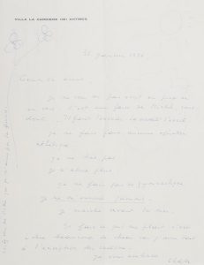 Amusante correspondance fantaisiste à une amie et admiratrice. [22 mai 1958]. « Chère Piquette Colard, De toutes façons j'ignore de fond en comble le sens périssable que vous donnez à mes contours ! Quelle équivoque ! Suis-je digne d'autant de sollicitudes que seul votre bon sens parvient à mettre en équilibre dans votre Thalamus ? »... [La Varenne] 5 ou 6 décembre [1964], avec dessin en marge le montrant soulevant des altères. « Je n'ai pas mal au bard -mais à la main. À force d'écrire n'importe quoi à des tas de crétins », mais il est bien obligé puisqu'il vaut mieux « être bienveillant avec ses créanciers »... [Juan-les-Pins 26 mars 1965]. « Je suis loin de mériter votre façon de me voir mais peut-être aussi que vous manquez un peu de jugement à mon égard, c'est mon seul bénéfice avec vous ! »... La Varenne 16 juin 1966. Il ne lui en veut pas : « Si je ne dine pas avec le Secrétaire Général du Figaro c'est parce que ça m'emmerde et non parce qu'il a peur de mon fantasque. J'ai renoncé aux honneurs et la gloire ne m'intéresse que dans la mesure où elle “m'arrange” vis-à-vis de ceux qui m'aiment. Ne vous faites pas un monde de ma vie : elle est simple, saine et naturelle puis que je vis dans ma nature. [...] Je suis loin, très loin, très haut dans les béatitudes enchanteresses de mes dons. Je crois au bon Dieu qui est en moi. Les choses défendues ne sont agréables que si le diable les interdit. Le diable, c'est les autres, a dit à peu près, Sartre. Voilà pourquoi je suis parfaitement heureux seul dans ma poésie. Dormez en paix ! »... Antibes 20 juillet 1967, lettre ornée de dessins de fleurs. Il conseille à Colette de s'ouvrir, de « vivre plus extérieurement, ce qui ne vous empêcherait pas d'avoir des visites profondes en vous. J'ai, pour ma part, toujours vécu en dehors, si bien que ma réputation d'être léger est définitive ». Mais il a gardé le meilleur de lui-même pour lui, intact dans son creur. « Si bien que je ne compte sur personne. Les amis charmants sont introuvables. Il y a les charmants qui ne sont pas des amis et les amis qui vous aiment sans charme. J'ai toujours été la victime [... ] de cette étoile au jour de laquelle je suis éclairé et qui n'est pas le Soleil. Le Soleil c'est les chansons. Les chansons c'est le 30 % de moi-même. Je vis à peu près retiré des chansons qui pourtant me font vivre. Je ne compte pas remonter sur scène. J'en ai marre de faire le guignol »... Antibes 31 janvier 1974, lettre ornée de dessins de fleurs, du soleil, et d'un autoportrait d'un trait léger comme en filigrane. « Je ne fais faire aucune opération esthétique. Je ne bois pas. Je n'aboie plus. Je ne fais pas de gymnastique. Je ne m’ennuie jamais. Je marche devant la mer. Je fais ce qui me plait c'est-à-dire beaucoup de choses car j'aime tout à l'exception du sadisme ». Il ajoute en marge : « Sortez vous de l'idée que je n'aime pas les femmes »... Au dos il a ajouté 6 courtes lignes : « Pour dire je t'aime j'ai peur d'écrire un poème. en prose j'ose. En vers je m'y perds »... Plus un billet au dos d'une carte commerciale de son père (Trenet, 12 rue Saint-Sulpice. Pianos. Musique ancienne et moderne. Lutherie d’art. Phonos et disques), remerciant Colette de l'envoi d'une médaille : « elle représente beaucoup pour moi mais c'est peut-être trop : votre souvenir de communion ! »... ; et un autre de 1974 au dos d'une carte postale de sa propriété du Domaine des Esprits à Aix-en Provence : « Vieux murs au soleil et vieux creur ensoleillé à l'intérieur »... On joint un billet a.s. de Trenet à son père écrit au dos d'une enveloppe (1945) ; une photo signée (carte postale, 1966) ; un menu manuscrit (15 oct. 1945) ; et une aquarelle gouachée, légendée au dos : « Barbouillage fait avec les couleurs de Charles enfant. Perpignan juillet 1945 ».