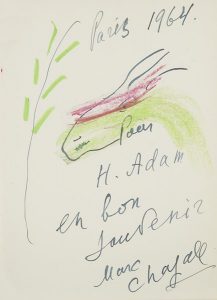 Catalogue de l'exposition (16 juin-30 septembre 1961), illustré de 22 horstexte de Chagall dont 4 en couleurs, 5 photos hors texte dont 2 à double page d'Izis (Chagall au travail dans l'atelier Simon, Chagall à Reims, la Synagogue en construction, portrait de Chagall, et vue de Jérusalem). Envoi autographe signé sur la page de garde : « Paris 1964. Pour H. Adam en bon souvenir Marc Chagall », avec dessin original à l'encre bleu-noir et aux crayons de couleurs : tête de cheval et branche de feuillage.