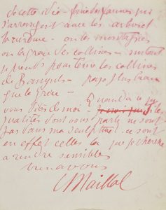 [Paris 9 octobre 1907] : « Je vous envoie tout ce que j'ai comme photographies »... Marly-le-Roi [29 janvier 1911] : « Je suis heureux de voir que vous ne m'oubliez pas »... Marly-le-Roi. « Dans un temps où l'on craint comme la peste de se laisser aller à l'admiration, votre exemple me donne l'envie de vous écrire pour vous dire combien votre attention m'a touché »... Banyuls-sur-mer. On a dit tant d'absurdités sur le Salon d'automne. « Que de belles choses a montrées ce salon. Chaque année on peut y admirer les merveilles de l'art français, et dans presque toutes les critiques on trouve la moquerie et le rire imbécile. Admirable époque d'artistes que la notre mais quel public idiot. Je trouve qu'on ne loue pas assez Cézanne ou si vous voulez on ne l'admire pas assez. C'est qu'on ne le comprend pas. Il est vrai de dire que ce n'est pas facile. Avez-vous lu l'article que Maurice Denis a écrit sur lui »... Puis sur son travail : « Tout ce que je fais est destiné à la décoration de jardins. Je pars toujours de cette idée -faire des faunes qui s'arrangent avec les arbres et la verdure, ou les montagnes ou la grâce des collines -surtout je prends pour tème les collines de Banyuls - pays plus beau que la Grèce ».