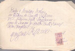 Reçus pour la vente d'reuvres de son père en 1922. 9 février 1922. « Vendu à M. Moline un petit tableau de Camille Pissarro n° 230 de l'inventaire Vue de ma fenêtre mille six cents francs »... 1er mars « quatre aquarelles de Camille Pissarro pour quatre mille francs »... 29 mars, le tableau « n° 35 Intérieur Vieille paysanne, pour la somme de quatre mille francs »... 3 janvier 1928. Il ne l'a pas convoqué chez lui car ses reuvres sont encore chez M. Mercier à l'exposition, où « il vous aurait été bien plus facile de les voir que chez moi dans mon atelier, sans feu ni lumière ! » Il lui envoie ses vreux de nouvel an en lui souhaitant « des tas d'or ! »...