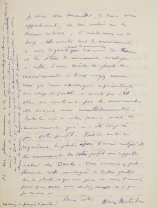 Très belle lettre sur son portrait dessiné de Montherlant. Il a reçu les photos de son dessin, photographié par Vaux, et il se rend compte en le regardant qu'il y a « plusieurs traits inutiles et même nuisibles. Il s'agit de l'indication des cheveux. Après avoir été surpris par le plat du profil dont les bosses différentes ne portaient pas j'ai trouvé que mon dessin était complet avec le petit crochet qui fait suite au front et indique les cheveux - que les 5 petits traits qui ont été surajoutés pour expliquer davantage les cheveux ne font plus partie de la même sensation et détruisent l'expression du rythme général. Aussi je viens vous demander, le dessin vous appartenant, de bien vouloir me les laisser enlever. L'oreille aussi est de trop - elle arrête tout le mouvement de ma ligne dont le mouvement doit avoir la tenue et la vitesse de mouvement analogique à celle d'une mèche de fouet en mouvement. Vous voyez comme moi qu'une arabesque représentant un coup de fouet n'existe pas si elle ne contient pas le mouvement, elle devient une nouille tourmentée. Toute la vie de votre dessin vient du mouvement qui m'a été inspiré par votre profil. Tout de suite en regardant la photo après l'avoir analysé et le mouvement de votre profil me rappelle celui de Dante. Vous connaissez probablement cette analogie »... Il précise encore, en postscriptum : « Ma phrase commence à la pointe des cheveux et finit à la pointe du maxillaire - étant donné d'authenticité de ceci, tout ce que j'avais ajouté le détruisait - et l'empêché de vivre dans l'espace représenté par ma feuille de papier ». Il ajoute : « Excusez ce français de peintre ! »