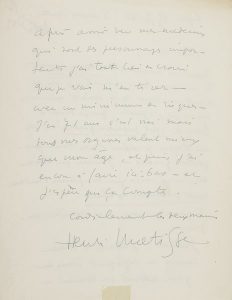 Dans l'attente de l'opération de sa tumeur cancéreuse. « Dans un moment de ma longue nuit d'insomnie il me revient dans l'reil que je vous ai écrit au sujet de la sérénité extraordinaire que j'éprouve, que je pense à Socrate tout prétention gardée. C'est un lapsus je voulais écrire toute proportion gardée -j'aurais pu écrire si j'avais vu ce que ma plume écrivait toute prétention exclue. Je pense que vous m'avez cependant compris. - J'attends ! J'attends l'heure comme un voyageur dans une gare attend son train - après avoir vu mes médecins qui sont des personnages importants j'ai tout lieu de croire que je vais m'en tirer - avec un minimum de risques. - J'ai 71 ans c'est vrai mais tous mes organes valent mieux que mon âge, et puis j'ai encore à faire ici-bas - et j'espère que ça compte »...