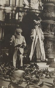 Claude Monet et sa femme à Venise. Photographie représentant Claude Monet et sa femme Alice entourés de pigeons, au coin de la Piazza San-Marco devant la tour de l'Horloge ; au dos, Alice Monet a inscrit l'adresse de sa fille Blanche, Mme Jean Monet, à Rouen. L'autre photographie montre Alice Hoschedé seule, entourée de pigeons devant la basilique San Marco ; elle a noté au verso : « Souvenir de Venise 8bre 1908. J'ai bien du mal à être rassurée », et le nom de sa belle-fille Mme Jean-Pierre Hoschedé.