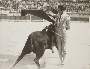 Belle photographie du matador espagnol Luis Miguel Dominguin toréant dans l'arène (tampon au dos PhotoGeorge, Arles), avec dédicace de Picasso au stylo bille bleu : « Picasso 12.10.58 Pour Madame Tamde ».
