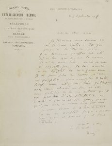 Auguste RENOIR (1841-1919). L.A.S., Bourbonne-les-Bains 8 septembre 1904, à un ami ; 1 page in-4 à en-tête du Grand Hotel de l’Établissement thermal (encadrée).