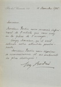 « Monsieur Rodin vous remercie infiniment de l'article que vous avez eu la grâce de l'envoyer. Croyez, Monsieur, qu'il sait estimer votre attention persévérante. Monsieur Rodin vous exprime sa reconnaissance et ses sentiments les plus distingués »...