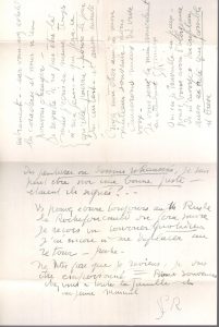 Au sujet de l'impression d'un ouvrage. Il pensait qu'on pouvait faire imprimer le texte « en réservant les blancs où iraient les culs de lampe [.] Mais ce n'est pas possible - attendez-moi. [.] vous avez acheté les caractères et nous n'en pouvons changer »... Il regrette de ne pas être là, mais sa femme fera ce qu'elle pourra pour le jour du concert et ensuite. « Oui ici je travaille en paix ». Il prie de lui envoyer « description aussi exacte que possible et brève des peintures ou dessins rehaussés, je suis peut-être sur une bonne piste - étaient-ils signés ? ».