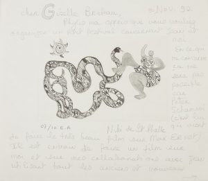 Rare eau-forte et aquatinte en épreuve d'artiste, numérotée « 07/10 E.A » et signée : Serpent et Nana. Autour de la gravure, l'artiste a écrit : « Cher Giselle B. [le grand G est orné comme une lettrine], Phillis m'a appris que vous vouliez organiser un petit festival concernant Jean [Tinguely] et moi. En ce qui me concerne ça ne sera pas possible pour moi » : Peter Schamoni, auteur d'un beau film sur Max Ernst, est « en train de faire un film sur moi et sur mes collaborations avec Jean, utilisant tout les anciens et nouveaux documents », documents qu'ils ne souhaitent pas révéler au public avant la sortie du film dans un an. En revanche, elle ne voit aucune objection à un festival sur l'reuvre de Tinguely, mais elle exige que soit enlevé « tout ce qui concerne nos collaborations, interview ensemble et sa participation dans mes films (Un rêve plus long que la nuit). Par contre je ne souhaite pas du tout qu'on montre les funérailles de Jean, film qui n'est pas fini d'être édité ».
