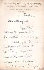 Paul SIGNAC (18631935). L.A.S., Jeudi, [au critique d'art Achille Segard] ; 1 page in-8 à en-tête Société des Artistes indépendants.