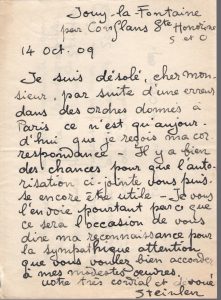 14 octobre 1909. Il envoie l'autorisation de faire photographier et reproduire ses reliures du Salon d'Automne : « ce sera l'occasion de vous dire ma reconnaissance pour la sympathique attention que vous voulez bien accorder à mes modestes reuvres »... 19 octobre 1910 : « le prix que vous offrez ne sera pas un obstacle à la condition que je sois absolument maïtre des illustrations - procédé d'exécution etc. Si vous êtes décidé encore à vous fier à moi -envoyez-moi le texte et un n° de la Revue Française. Je ne vous ferai pas attendre les dessins et désire qu'ils me soient paiés à livraison »...