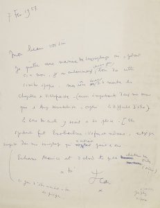 7 février 1957. « Je quitte une manière de sarcophage où, pendant six mois, je m'embaumais chaque jour loin de cette sinistre époque. Mon rêve serait de te montrer la chapelle de Villefranche -(aussi importante dans mon reuvre que l'Ange Heurtebise - Orphée - La difficulté d’être). Le livre des morts y serait à sa place ». Il évoque avec humour « Enobarbus-Véfour » (Raymond Oliver)... Milly 27 novembre 1957. « Je t'ai mal parlé de ton livre [La France irréelle] parce que je suis un âne de la politique, avec bonnet, coin et coups de règle sur les doigts. Ce qui m'enchante, c'est ce qui te tourmente : [...] une grâce exquise par la précision du “dire” et l'horreur du vague, du flou, ou bâclé si à la mode. On leur donne le Prix Nobel. Je te donne le prix Nobel »... 2 novembre 1962. Il souhaite l'associer à l'entreprise de La Comtesse de Noailles, oui et non ; il indique la composition de ce livre pour lequel il voudrait « une biographie qui n'en soit pas une et qui [...] la montre prise entre sa chambre de malade et le tumulte extérieur. En ce qui me concerne je ne parle d'elle que sous l'angle de cette fièvre de gloire qui l'a tuée. [...] il me faut ta voix racontant ses intimes et sa famille. [...] Je te demande de tremper le biscuit sec dans la tasse de Marcel. De la sorte tes exquises visites du matin seront sanctifiées par un livre »...