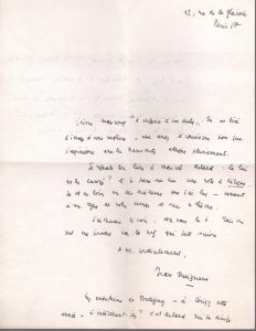 Félicitations pour son roman L’enfance d’un autre (La Table ronde), qu'il aime beaucoup : « Tu as livré l'image d'une rupture - avec assez d'équivoque pour que l'expérience que tu transmets atteigne pleinement. Je signale ton livre à Marcel Arland [...] et je passe sur lui une note à Critique. Il est de loin un des meilleurs que j'ai lus - venant d'un type de notre temps et sur ce thème ». Si les « entretiens de Pontigny », qui auront lieu à Cérizy cette année l'intéressent, c'est Arland qui les dirige : « Il doit y avoir Ponge et Blanchot ».