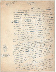 Henry de MONTHERLANT. Ensemble de manuscrits et brouillons autographes (un signé), et de tapuscrits avec corrections autographes ; environ 37 pages in-4 ou in-8.