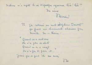 Paul morand. 6 L.A.S., 1949-1972, à Emmanuel Berl ; 3 pages obl. in-12, 2 cartes postales illustrées avec texte et adresse au dos, 4 pages oblong in-8, 3 enveloppes.