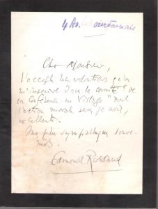 25 novembre 1917. « J'espère vous voir au Cercle Volney, à cette conférence que j'ai le grand honneur de présider et où votre souvenir fidèle m'a appelé. -En attendant je vous serais très reconnaissant de recevoir avec faveur un jeune poète élève de La Touche, notre si cher et regretté ami. [...] si vous causez un peu avec lui de toutes ces choses d'art et de décoration qui vous passionnent vous serez enchanté de le connattre »... - « J'accepte très volontiers qu'on m'inscrive dans le comité “de la Conférence au Village” dont l'action morale sera, je crois, excellente »... On joint une L.S. de Louis Labat, transmettant l'autorisation de Rostand à venir voir les peintures d'Arnaga (1912).