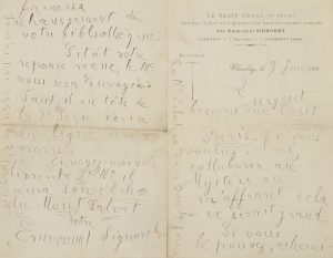 Emmanuel SIGNORET (1872-1900) poète. 20 L.A.S., 1895-1899 au poète et critique d'art Achille Segard ; 80 pages formats divers, plusieurs à en-tête Le Saint-Graal, quelques enveloppes (nombreuses mouillures, parfois fortes, avec fentes, et...