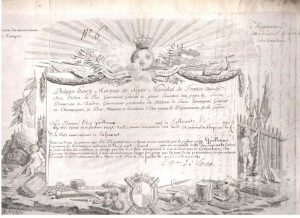 Philippe Denis de Senneville (certificat du régiment des Gardes Françoises, 1768), Félix controleur général de la Maison du Roi (certificat pour un écuyer de cuisine, 1752), Étienne-Gaspard de Fontenu consul de France à Livourne (1705), Louis XV (secrétaire, avec griffe du duc de Choiseul, 1763), Louis XVI (secrétaire, 3 dont un brevet de maréchal des logis, 1778-1791), Antoine de Sartine (1766 au duc de Choiseul), maréchal de Ségur (beau brevet de récompense militaire, 1784), marquis de Treffort (certificat de services, Lyon 1762). Et un certificat pour un engraisseur de volaille et aide cuisinier lors de la visite de Mesdames à Louvois (1786).