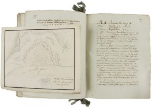 Armée du Nord. Manuscrit, Journaux des sieges des places d’Ypres, Nieuport, L’Ecluse, Bois-le-Duc Crevecreur Veule & Nimegue, [1794] ; un volume broché petit in-4 formé de 7 cahiers cousus liés de rubans verts, formant 148 pages, plus 3 plans...