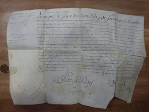 Brevets de trésorier de France garde scel au bureau des Finances à Riom pour Annet Foucher (1714), puis pour son fils Claude Foucher (1741 ) ; lettres d'intermédiat en faveur ce dernier, signées par Louis XV (secrétaire) et contresignées par Phelypeaux (1743) ; et pièces justificatives.