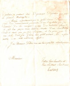 Cincinnati. Suivant l'autorisation donnée par le maréchal de Castries au comte d'Estaing, il fait savoir à ses officiers « que le Roy permet que vous soyez admis dans la Société de l'ordre de Cincinnatus »... Barras ne saurait traduire les termes du général Washington, qui a exprimé « le vreu de l'assemblée général dont il est le Président, l'estime et la reconnoissance qu'a inspiré à tout le continent de l'Amerique ce que la Marine du Roy y a fait », mais il rend compte des remerciements personnels de « ce grand homme » pour la « bagatelle que j'ai hasardé de lui envoyer au nom des matelots françois »...