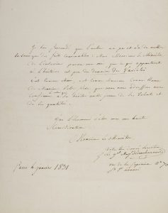 Il vient d'apprendre qu'on doit jouer au théâtre des Variétés une pièce sur L’Évasion de M. le comte de La Vallette, et il s'y oppose fermement comme « chef de famille [.] il est inconvenant de mettre en scène des personnages vivants et surtout des personnes qui nécessitent autant de considération par leurs vertus et leurs malheurs »... Il rappelle l'état de santé de sa fille la comtesse de La Valette, « qui a été le résultat de ses malheurs et de son dévouement héroïque : ce motif seul me semble mériter une considération particulière » [elle sauva son époux de la condamnation à mort en prenant sa place en prison, mais perdit la raison suite à sa détention]...