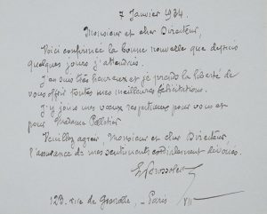 Rare. « Voici confirmée la bonne nouvelle que depuis quelques jours j'attendais. J'en suis très heureux et je prends la liberté de vous offrir toutes mes meilleures félicitations. J'y joins mes vreux respectueux »...