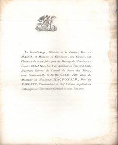 3 faire-part envoyés au comte Roger-Ducos (1809-1810, mariages La Rochefoucauld-Aldobrandini et Régnier-Macdonald, décès de la princesse d'Arenberg). Acte de vente à Limonest (1835). Chanson impr. à bas les traitres ou Dreyfus en crèvera. Manuscrit autographe de Masini, La Fille de l’air, paroles de romance. Lettres et cartes adressées à une actrice (Catulle Mendès, Albert Carré, F. Sarcey, M. de Féraudy, etc.). 6 photos de presse (Marcel Cerdan, Maurice Chevalier, Georges Carpentier lors d'un entraïnement, une signée par Tino Rossi). Portrait dédicacé de Sylvie Vartan.