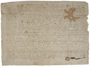 GUYENNE. Pièce sous seing manuel d'Arnaud Bomon, notaire public du duché de Guyenne, Saint-Germain du Puch 9 février 1416 ; parchemin obl. in-fol. (22 x 30 cm ; mouillure, et quelques fentes et petits trous aux plis) ; en occitan et latin...