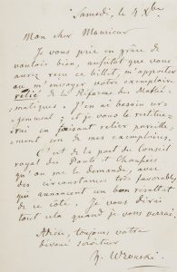 Il presse Dossaris d'aller réclamer sa copie à M. Augé : « Le moindre retard pourrait dans ce moment si critique devenir extrêmement préjudiciable à nos grands intérêts » (28 février [1835]). Il précise le nombre de feuilles encore à composer, évoque un dépot d'exemplaires à la librairie de Treuttel et Wurtz, s'impatiente de ne pas trouver M. Augé alors que leurs « affaires de locomotion [.] sont maintenant devant une Commission du gouvernement » (22 octobre [1843]). Il demande à emprunter un exemplaire de la Réforme des mathématiques pour le Conseil royal des Ponts et Chaussées (4 décembre [1847 ?]). Copies ou mises au net soigneusement calligraphiées de plusieurs textes : son Cours de Mathématiques traduit de l'anglais par Lazare Augé (publié à Londres en 1821, il est dédié au Tsar Alexandre Ier) ; Pourquoi la déchéance de l’homme ?... ; un Tableau encyclopédique de l’art de la guerre... ; et le plan d'une Création de la Nature.