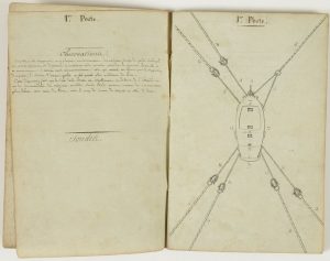 Recueil détaillant 34 postes d'amarrage, chacun soigneusement dessiné à l'encre noire, avec, en regard, des observations et précisions sur les sondes.