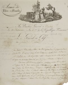 Jean Charles PICHEGRU (1761-1804) général. L.A.S., Q.G. de Mannheim 23 vendémiaire IV [15 octobre 1795], au général Michaud ; 2 pages in-4, belle vignette gravée et en-tête de l'Armée de Rhin et Moselle (lég. mouillures avec coin abimé sans...