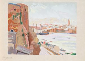 TIRAGE A 100 EXEMPLAIRES GELINET Marcel. Impressions Marocaines. Peintures et croquis. Paris, A compte d'auteur 1931 ; in-folio Oblong cartonnage illustré de l'auteur, sous chemise demi-percaline verte et étui. 25 planches hors texte de Marcel...
