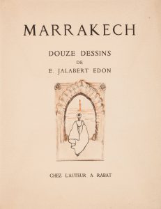JALABERT EDON (Eliane). Marrakech. Rabat, chez l'auteur s. d. (1930) 1930 in-4 en feuilles sous marie louise et emboitage remplié en raphia; 12 de dessins avec rehauts de gouache; tirage limité à 500 exemplaires numérotés, celui-ci porte le 149....