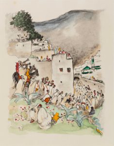 JALABERT EDON (Eliane). Itinéraire au Maroc. Rabat, Société des amis des lettres et des arts; s; d; (1930) in-4 en feuilles 10 dessins avec rehauts de gouache, sous marie louise, chemise rempliée et entoilée de tissu marocain. Tiré à 200...