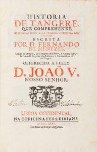 MENEZES Fernando de. Historia di Tangere que comprehende as noticias desde a sua primeira conquista ate a Sua ruina. Lisbonne, Officina Ferreiriana 1792 in-folio basane brune, dos à nerfs orné de motifs dorés, pièce bordeaux, tranches...