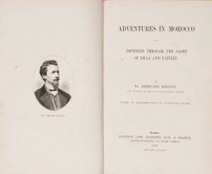 ROHLFS Gerhard. Adventures in Morocco and journey through the Oases of Draa and Tafilet. Londres, Sampson Low 1874; in-8 demi basane marron à coins, dos à nerfs, pièce de titre. viii-371 p. avec 1 portrait frontispice et 1 carte couleurs repliée....