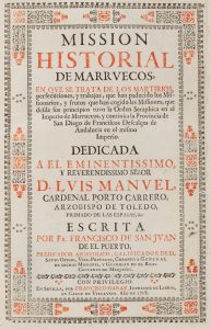 SAN JUAN DEL PUERTO Francisco de. Mission historial de Marruecos en que se trata de los martirios. Séville; Garay 1708; in-folio vélin souple, frontispice gravé d'après Pietro de Pietri, titre en rouge et noir, 20 f. n. ch.-829 p.- 8 f. n. ch. de...