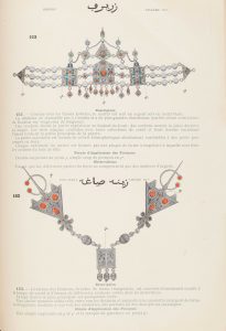 Les 58 feuillets portent 156 illustrations de bijoux algériens, imprimés en chromolithographie, or et argent. Chaque modèle est accompagné de son nom arabe (et de la transcription française), suivi d'un descriptif : mode de fabrication, utilisation, lieux d'origine.