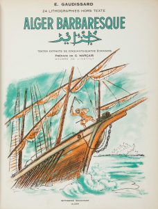GAUDISSARD (Emile). Alger barbaresque. Alger, Baconnier 1951 ; in-4 plein maroquin marron, dos lisse, titre doré, premier plat incrusté d'un dessin, couverture en couleurs conservée; avec 24 lithographies hors-texte; tirage limité à 250...