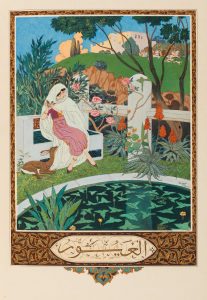TOUSSAINT Franz. Le jardin des caresses. Paris, Piazza 1914; in 4 maroquin vert, dos lisses portant un décor mosaïqué et doré de listels bruns et feuillages rouges, sur les plats, large encadrement et médaillon arabisants mosaïqués et dorés...