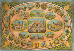 LA MECQUE. Image représentant la Mecque au centre et, tout autour, dans deux chapelets les étapes sacrées; avec médaillons angulaires de citations coraniques. Aux angles quatre médaillons ovales d'invocation d'Allah enlacés de prières et...