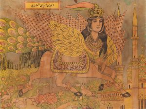AL-BURAQ. Image représentant l'ascension de Majomet guidé par l'ange Gabriel. Sur la selle : " Gloire à celui qui a transporté son serviteur, la nuit, de la mosquée sacrée à la mosquée al-Aksa ". Symbole du plus grand miracle accompli par le...