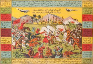 LA GUERRE AU HEDJAZ. Prise de la ville de Taif par les Wahabis en 1924. Image de bataille rangée aux portes de la ville avec en titre « la guerre au Hedjaz, l'attaque des troupes wahabis de Taif et sa conquête après la défaite des troupes du...